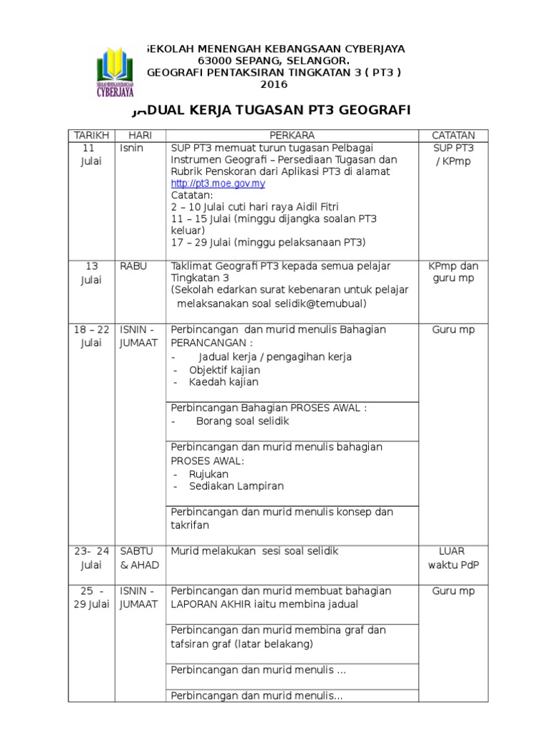Contoh jadual kerja geografi pt3 2018. You cannot afford to miss them! Pihak sekolah bertanggungjawab memastikan klgt3 dilaksanakan mengikut tempoh. Menurut jadual peperiksaan pt3 yang dikeluarkan oleh lembaga peperiksaan malaysia. Enter your email address into the form below to join 25,000+ students who get all the latest pt3 2015 tips and trial papers via email.